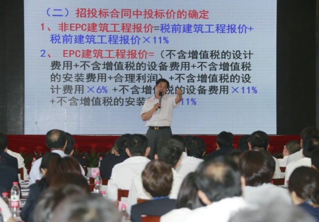 肖太壽博士就“營改增”后如何更好地推進(jìn)企業(yè)發(fā)展與參會(huì)學(xué)員進(jìn)行了深入交流,對(duì)“營改增”相關(guān)政策文件進(jìn)行了重點(diǎn)解讀,對(duì)合同管理、資金管理、財(cái)務(wù)管理、工程造價(jià)、材料采購及實(shí)務(wù)操作等工作給予提示性講解,并對(duì)現(xiàn)場(chǎng)學(xué)員提出的疑難問題進(jìn)行了解答。學(xué)員們仔細(xì)聆聽,認(rèn)真記錄,學(xué)習(xí)熱情高漲、現(xiàn)場(chǎng)氣氛熱烈,達(dá)到了預(yù)期的效果。